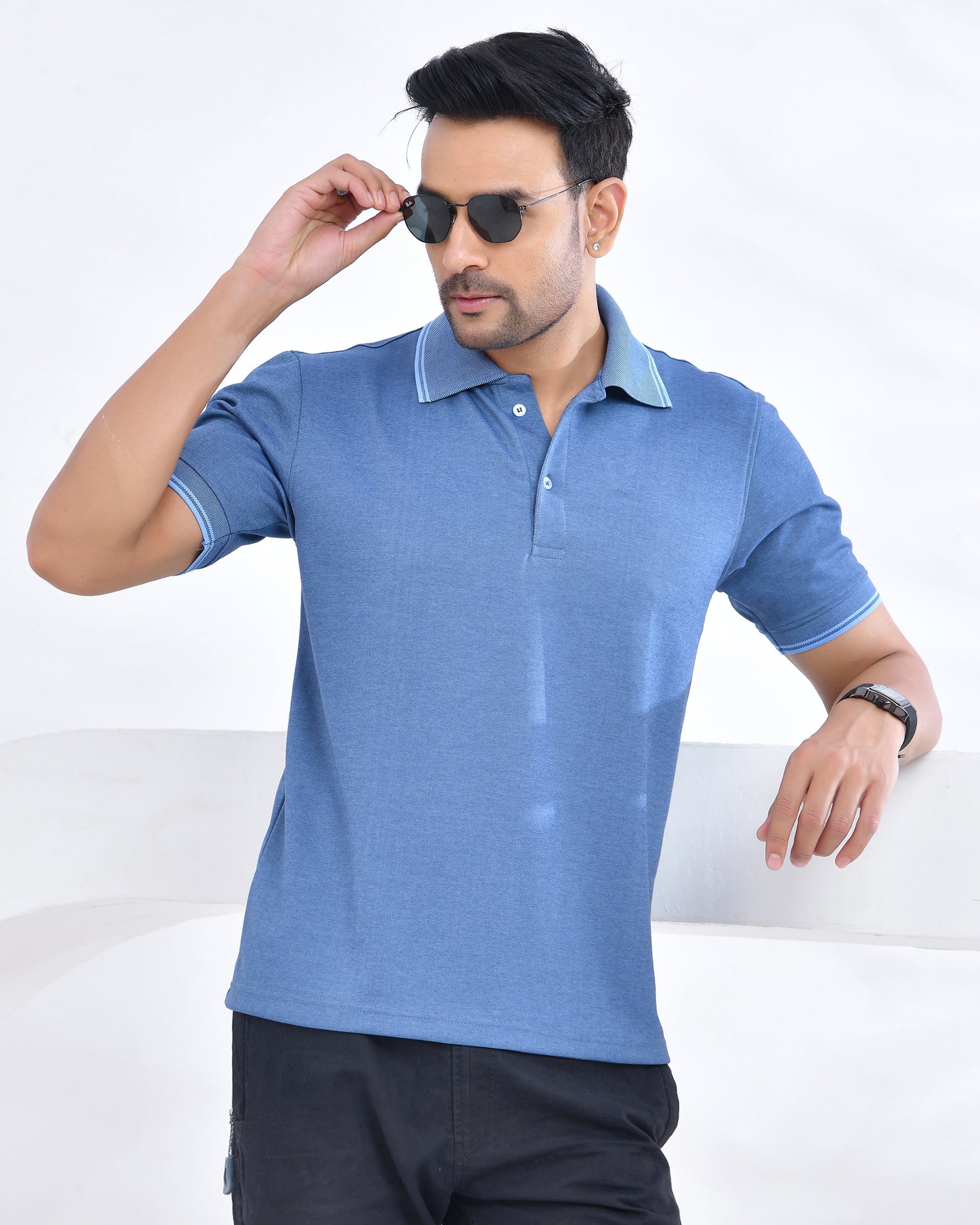 Keep it cool and classic with this blue knitted collar t-shirt, designed for everyday comfort and effortless style. Featuring a smart collar, half sleeves, and a soft knitted texture, this t-shirt adds a polished touch to your casual look.
